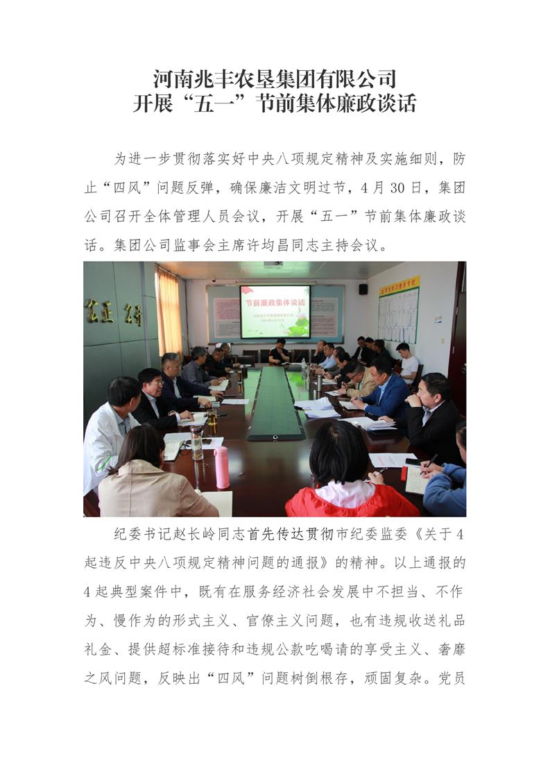 · 河南兆豐農(nóng)墾集團有限公司 開展“五一”節(jié)前集體廉政談話